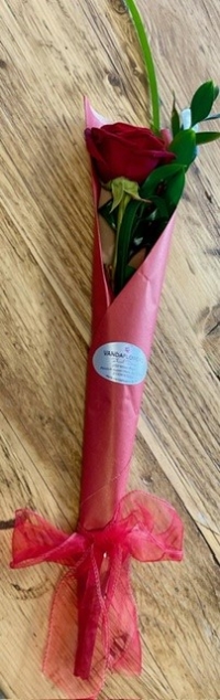 A beautiful single red rose with foliage, wrapped and presented with a ribbon bow.